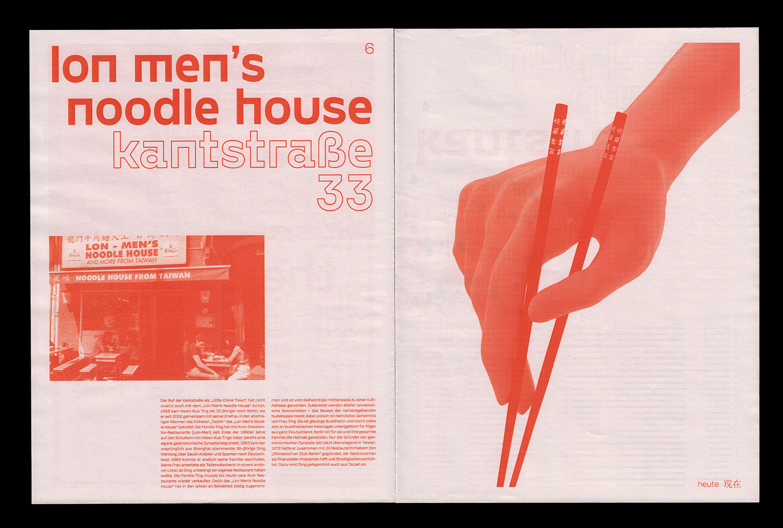 Unbeknownst to most Berliners, Kantstraße's status as Berlin's Little Chinatown dates back more than a hundred years. The self-published newspaper tells the story of the first Chinese students settling in the area, the famous celebrity hot-spot Asian restaurants of the 1960s, and the diverse restaurant culture it features today. Designed in collaboration with Lea Flemming, with texts by journalist and sinologist Dagmar Yu-Dembski, the daughter of the founder of one of Charlottenburg's first Chinese restaurants after the Second World War.