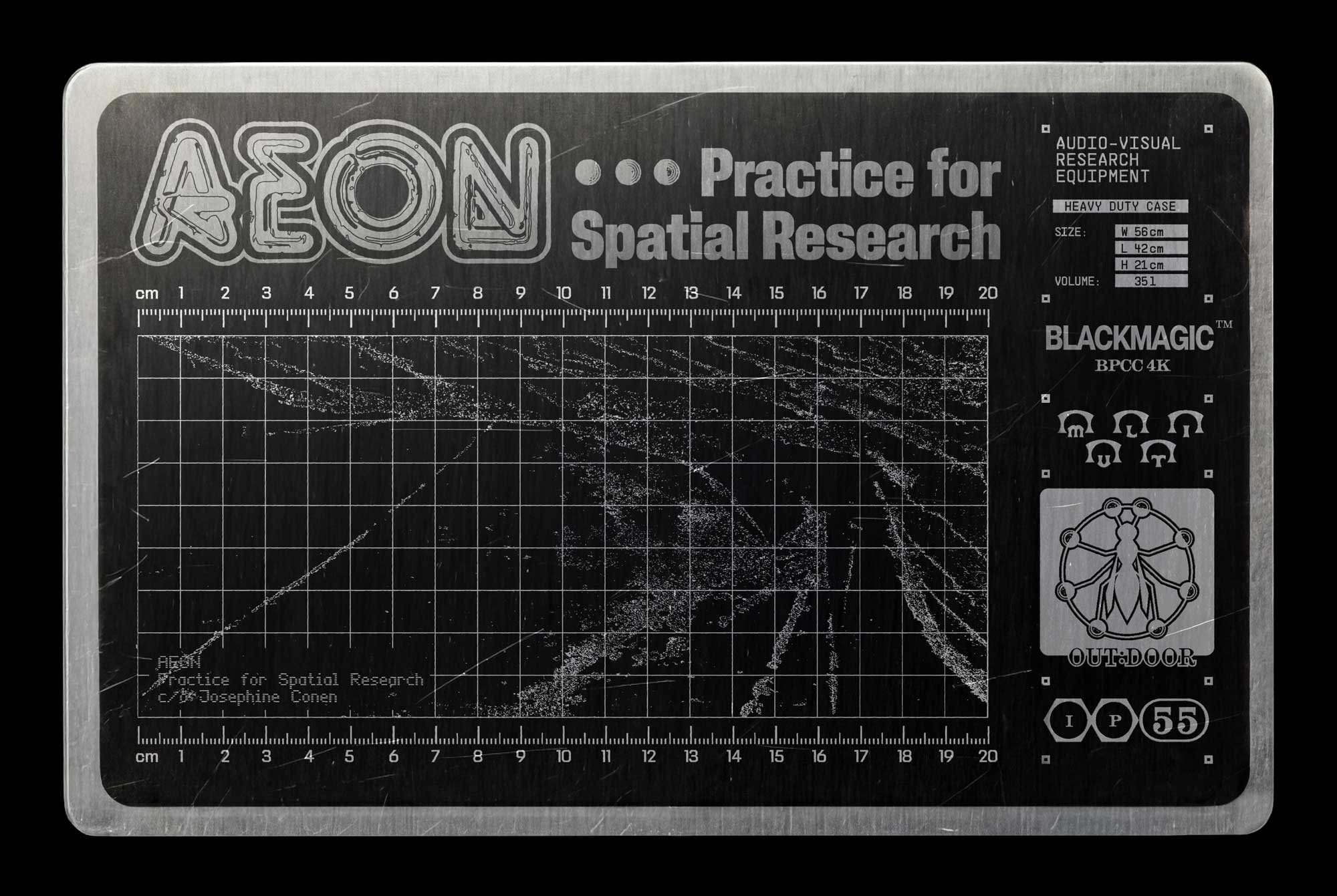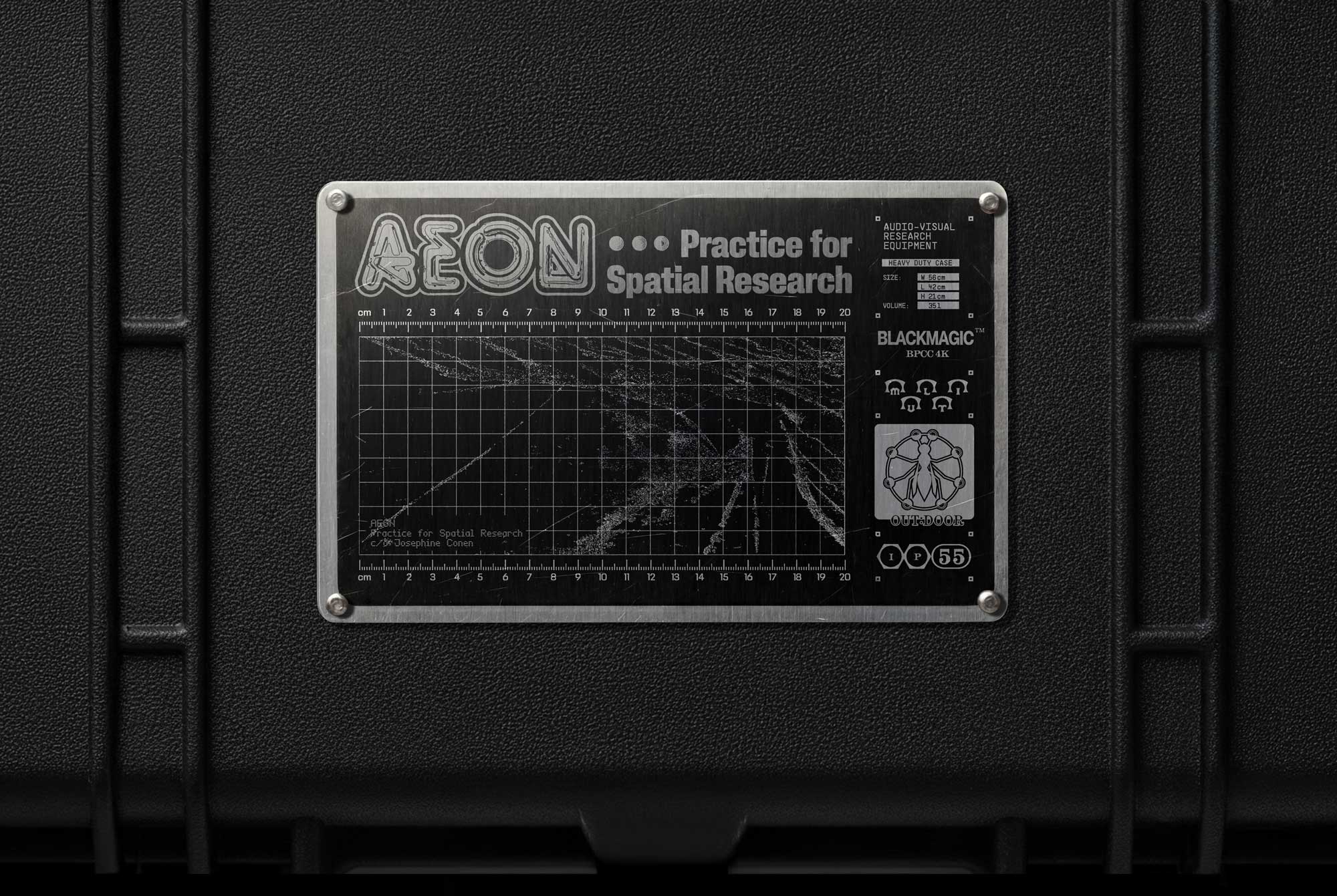 Metal plaque for equipment hard cases by AEON. AEON is the spatial research practice of artist and filmmaker Josephine Conen. UV print on brushed aluminum.